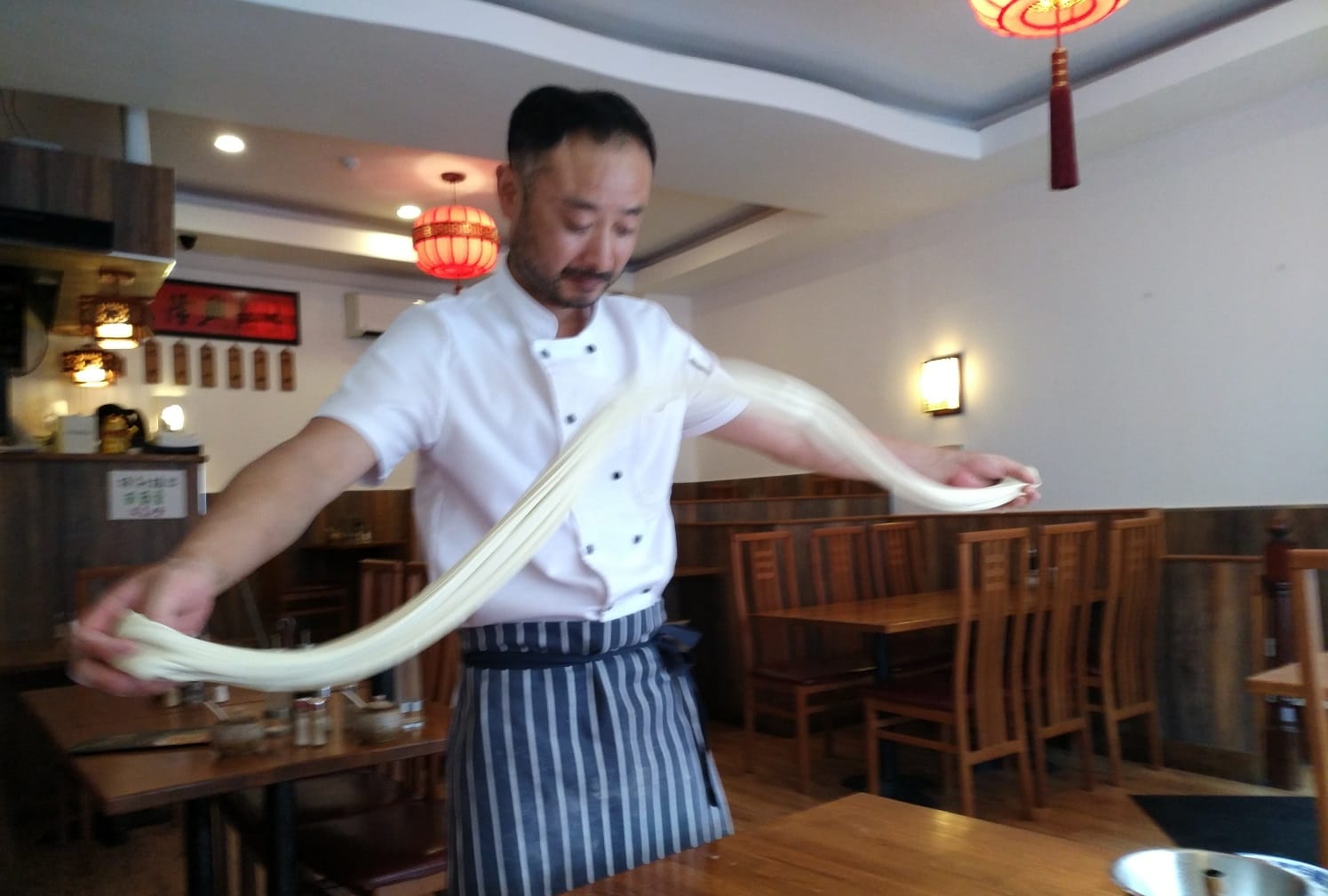 Hand-pulled noodles are common street food there, he says. His job had been to pull dough into shape, day in, day out.