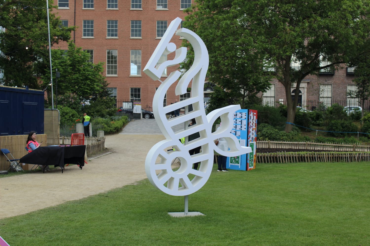 Under an off-white tent in the middle of Merrion Square park, a crowd sits in rows of dark grey fold-up chairs.