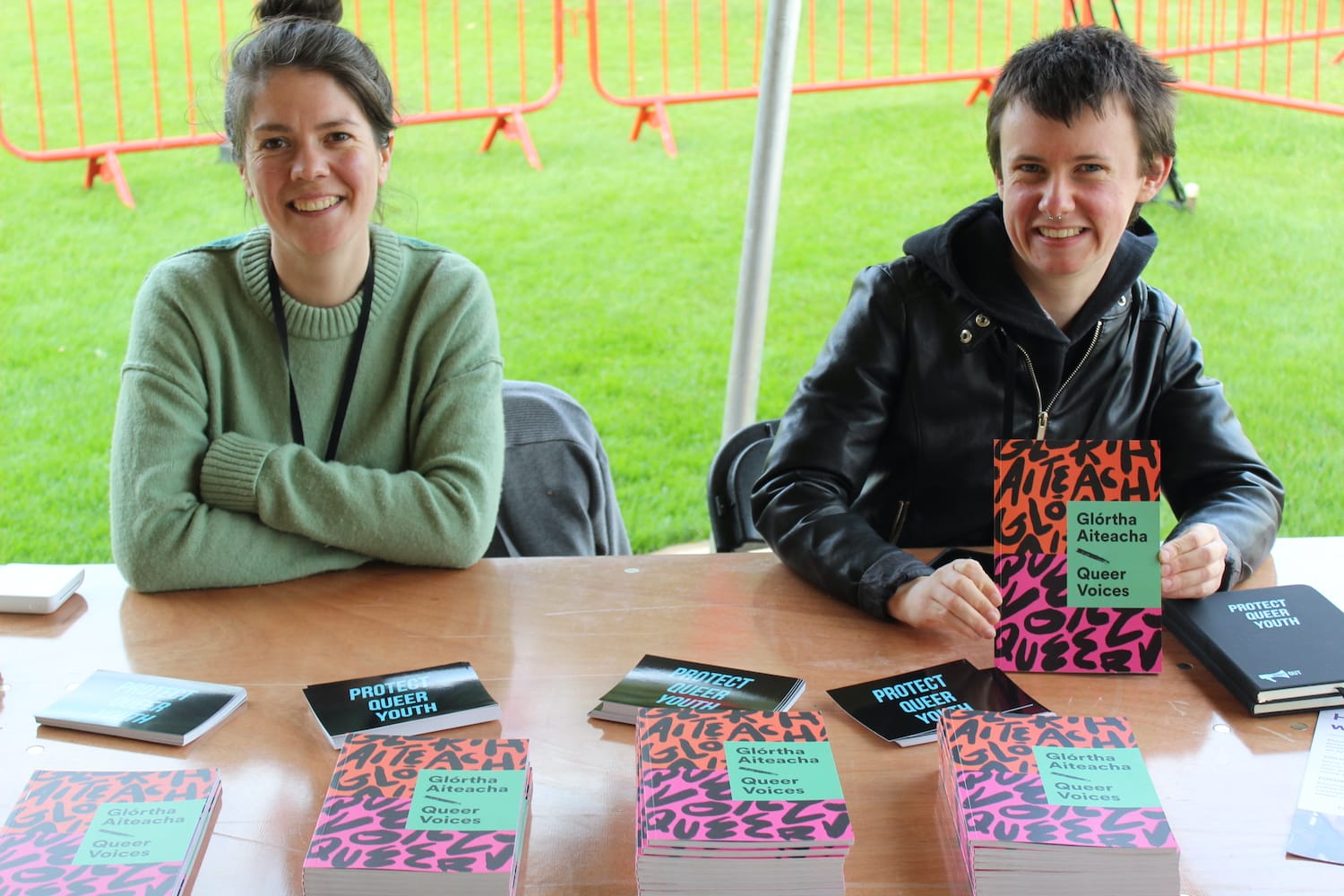 Tilly Taylor is the training and development manager with ShoutOut, the Irish LGBTQ+ charity that published the book. She is running a stand at the back of the tent with Ollie Bell, stacked with copies of it.