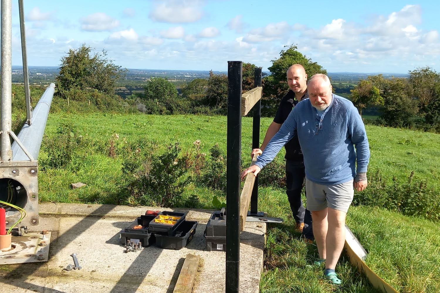 High on a hill, he’s got a view of farm fields (close), data centres (far) and the Poolbeg towers (like matchsticks in the far distance).