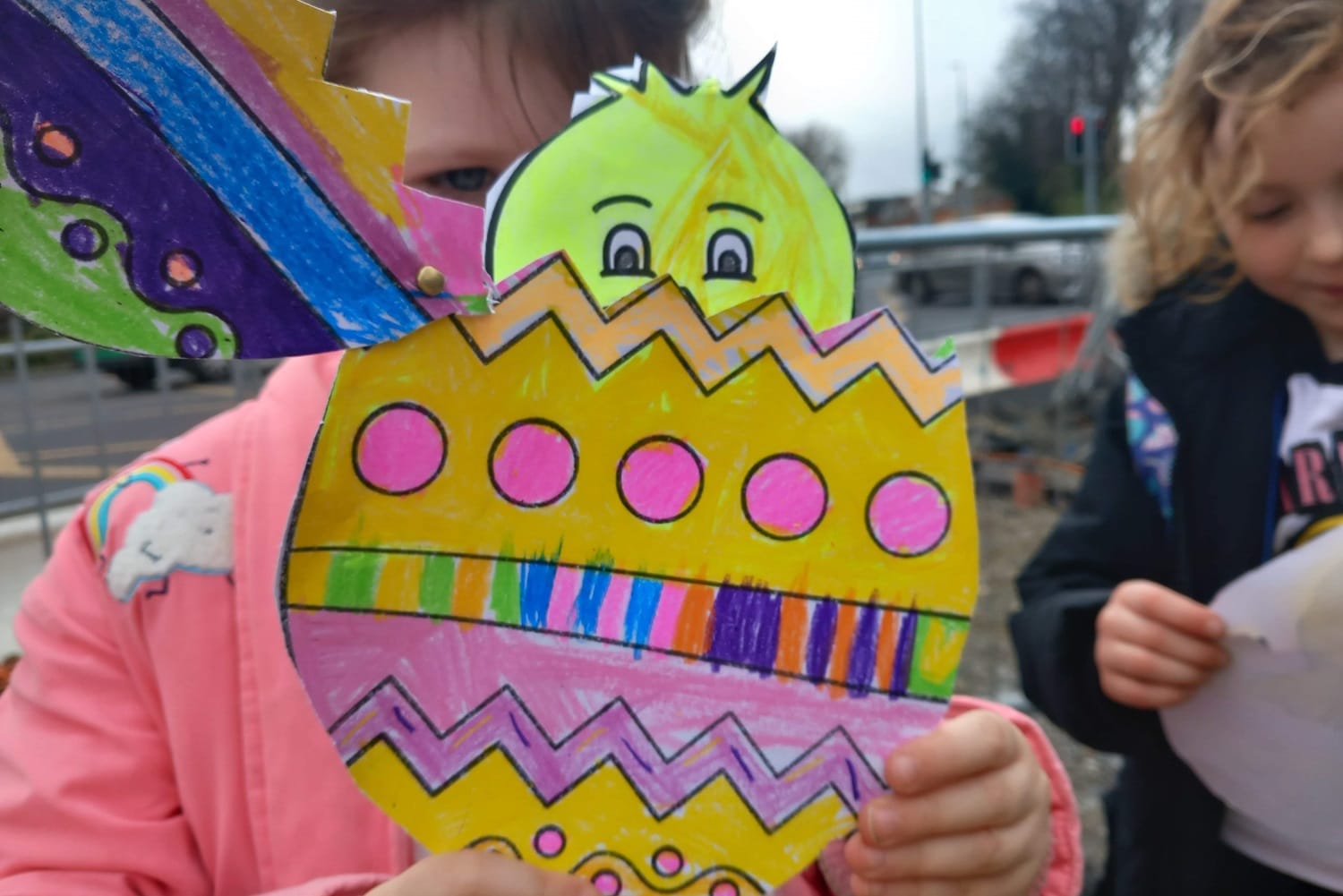 They were showing off colourful drawings of Easter eggs. “Look, a chick!” says Juliet, swinging the top of her egg open to reveal a drawing of a little yellow bird.