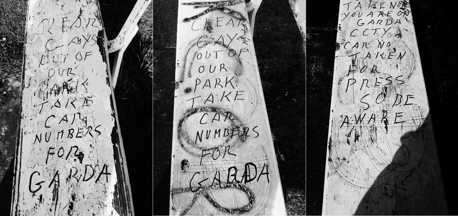 1. This work is . . . a series of three grainy, gritty images of a park bench at Dublin’s Phoenix Park, taken over a six-year period, which document a certain type of alienation. The first image’s text reads “CLEAR GAYS OUT OF OUR PARK TAKE CAR NUMBERS FOR GARDA”. By 2014, this has mutated into “TAKE NOTE ON GARDA CCTV CAR NO TAKEN FOR PRESS SO BE AWARE”.