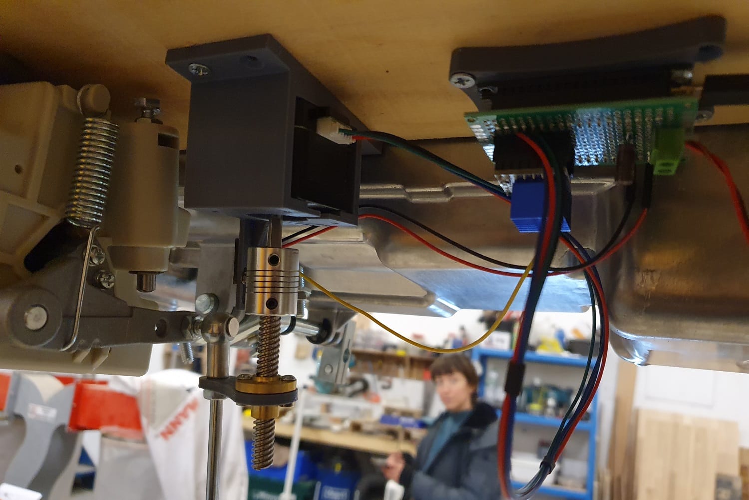 The table stands on top of another table, lifted so that Guinan and Frank Prendergast, another artist, can easily fiddle with the twists of wires and computer parts attached to the sewing machine.