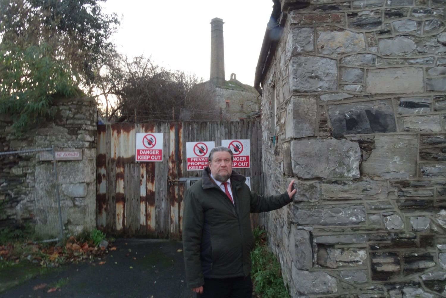 Back in Rowserstown Lane, Foley is still standing outside the grounds of Kilmainham Mill. A “Danger Keep Out” sign hangs on the locked gate.