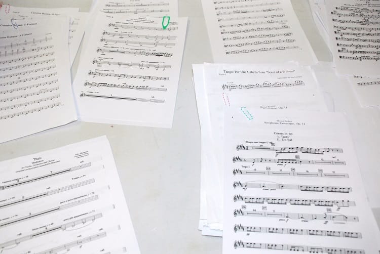 Near the orchestra, sheet music is spread out in anticipation of the upcoming concert on 2 December in St Peter’s Church in Phibsboro: Carl Orff’s ‘O Fortuna’ from Carmina Burana, Jules Massenet’s ‘Méditation’ and Carlos Gardel’s ‘Por una Cabeza’, best known from the tango scene in the film Scent of a Woman.