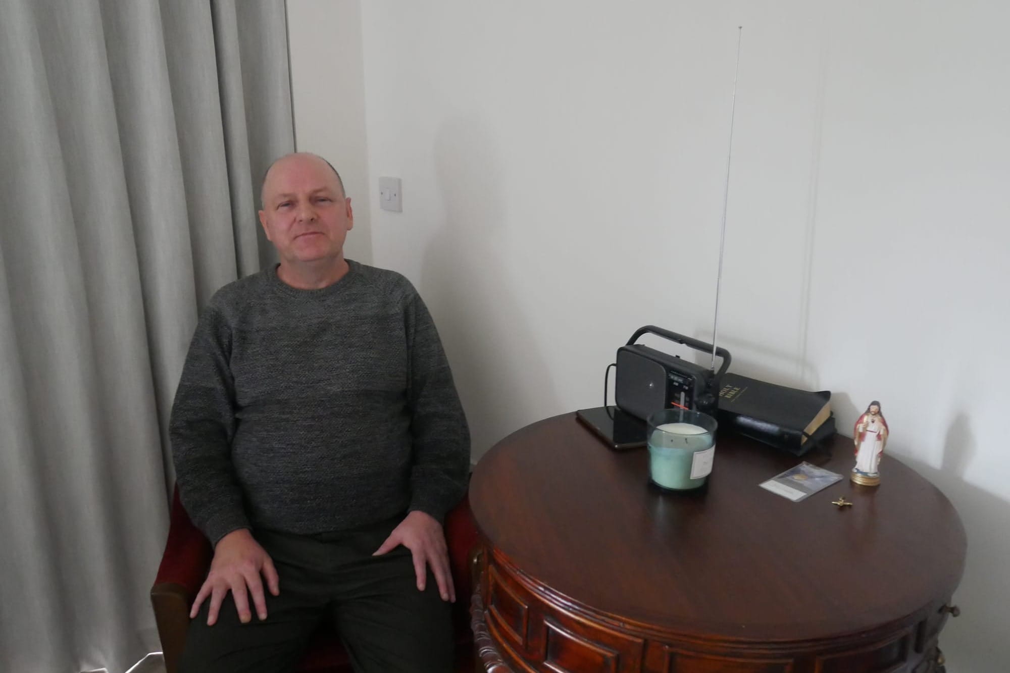 Waters is sat in a chair in the corner of his living room. On the coffee table is a candle, a radio, a Bible, and a small figurine of Jesus.