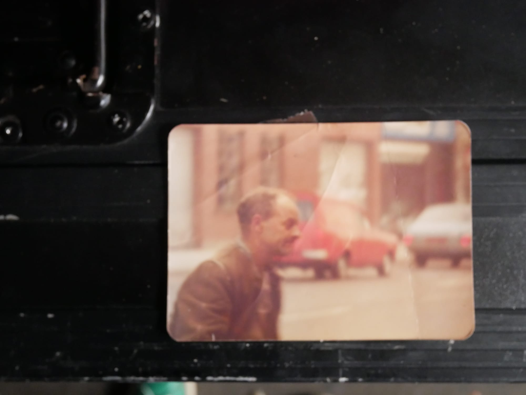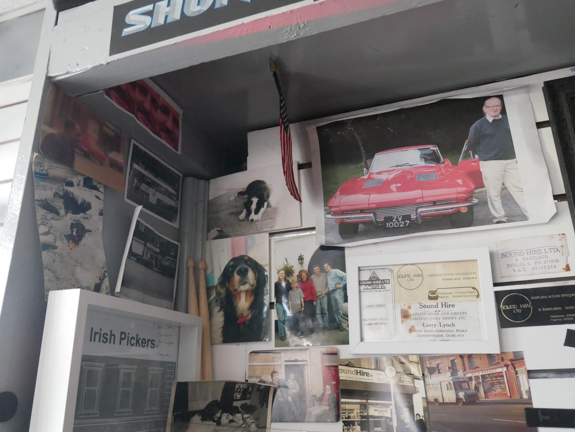 He reaches behind him and untucks a photo. It was lodged in the corner of an alcove, alongside faded photos of dogs, Ranelagh shops, and old receipts and business cards.