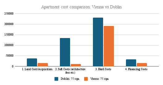 The largest difference, that comparison suggests, creeps in through the “soft costs” – with those coming in at €10,700 for a 75sqm apartment in the Austria scheme and at €134,000 for a same-size suburban apartment in Dublin.