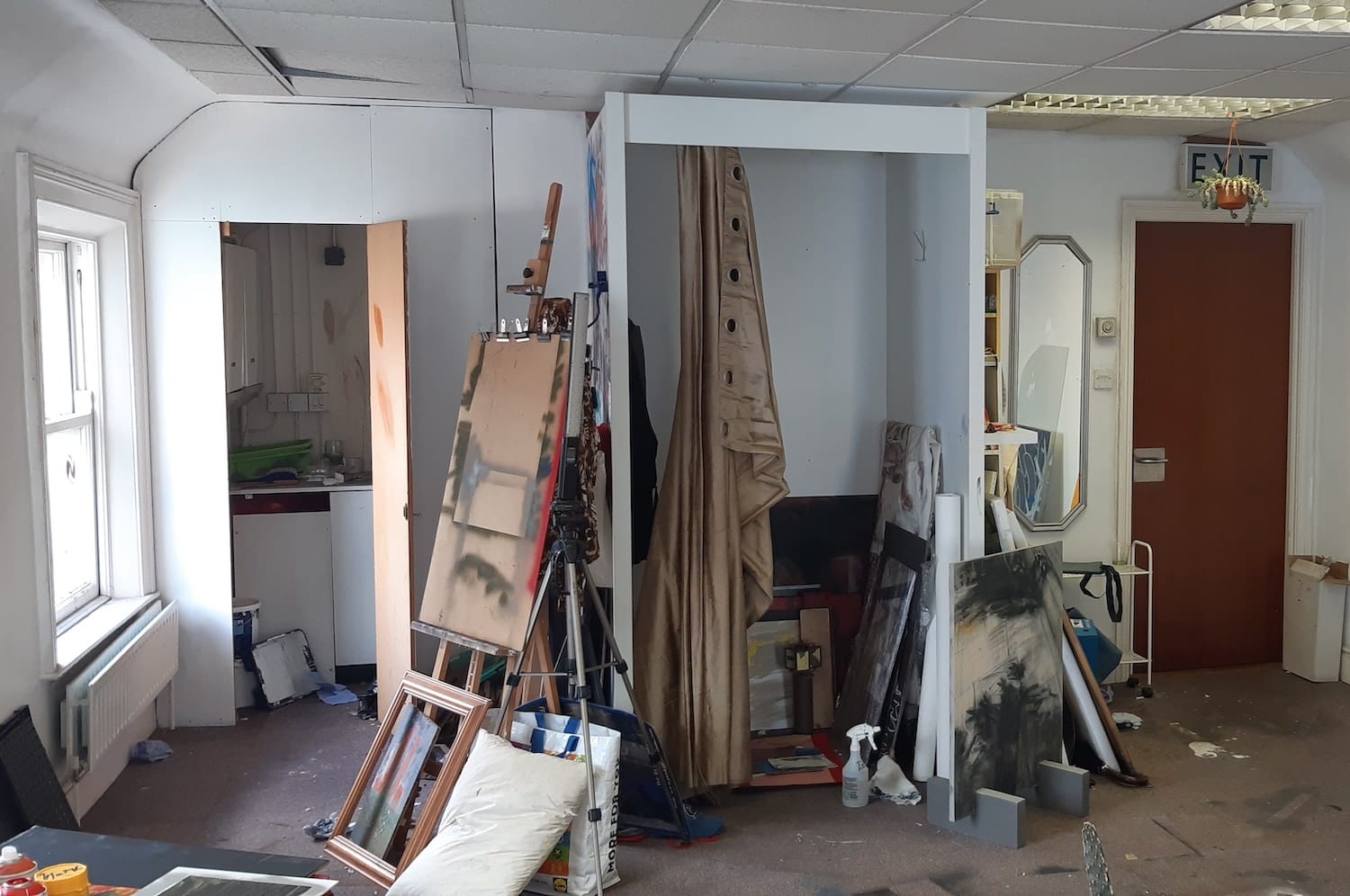 A changing room is now Kernan’s storage space. The walls show some of his larger abstract canvases.