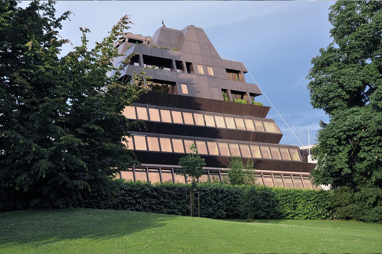 The metallic facade transformed the appearance of the building, giving it the futuristic style we know today. It also made it look a lot like another building in Zurich in Switzerland, called the Ferrohaus.