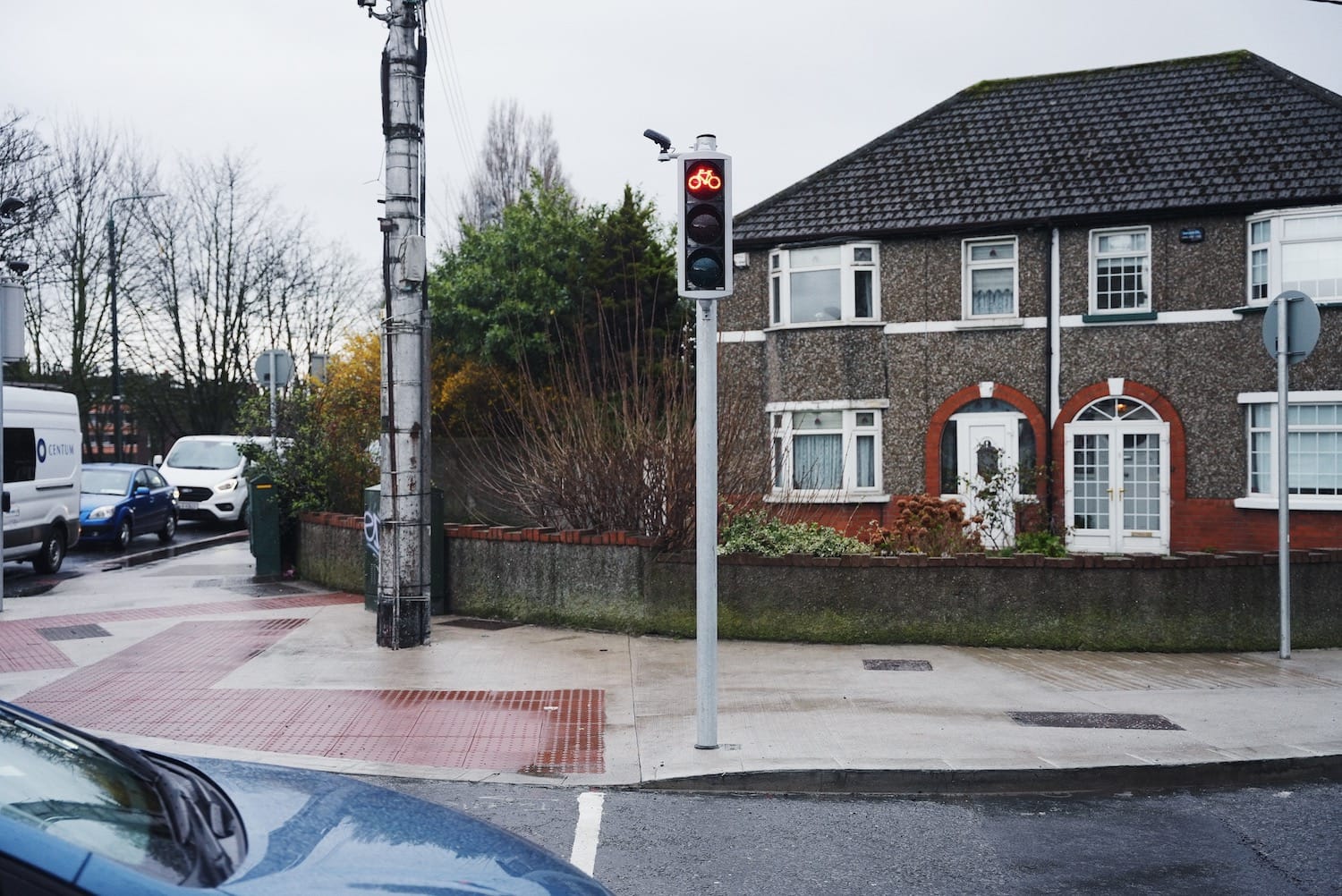 Standing on the south-west corner of the intersection, looking east across the new pedestrian crossing, there is a traffic light for cyclists: little red and little green bicycles to tell cyclists when to stop and when to cross.
