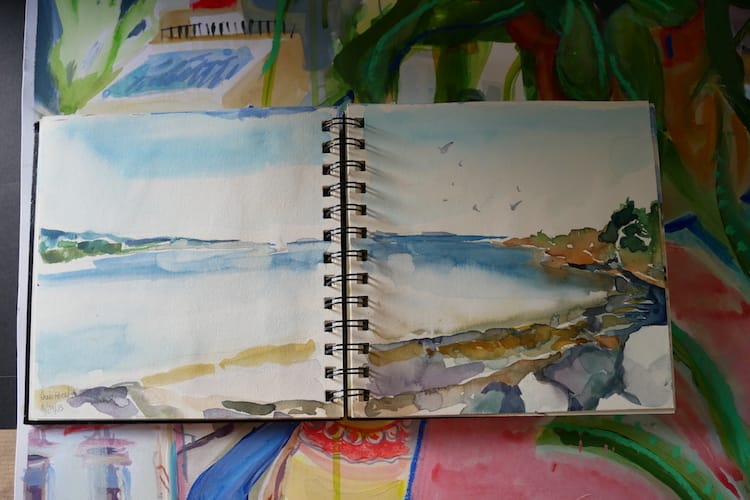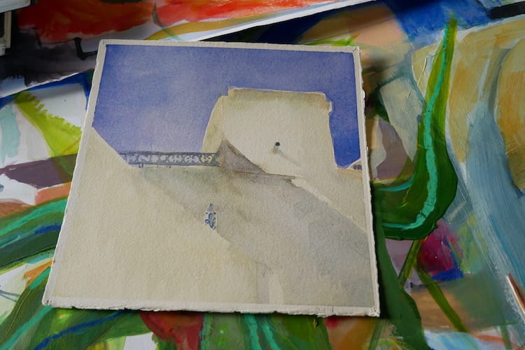 She spreads out some watercolours on the large table in her studio: there are bright blue skies, and the sandy yellows of a Portuguese landscape. Some show the rocky shores of Maine, others the bright-green plants in an Indian garden.