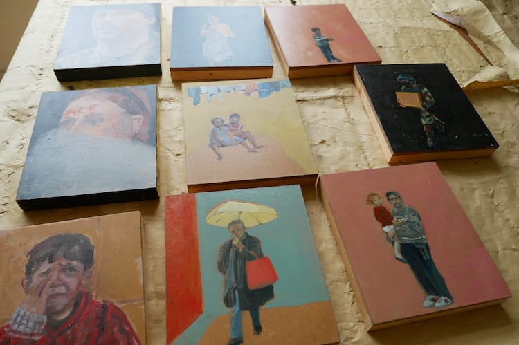 In another, she shows the larger “Incidental Icons” she has worked on. The portraits are painted on blocks of wood, inspired by the Fayum portraits of Egypt, and taken from the faces in the photographs that fill daily newspapers, which are disposed of as the news cycle moves on.
