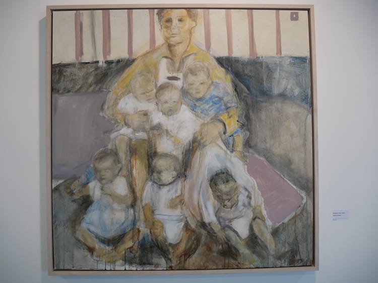 One, Strangers now, foster children, is of a woman, with a blank and emotionless face, in a huddle of babies. There are three bunched at her feet. Another three in her arms. It is painted in muted pinks, blues, and browns.
