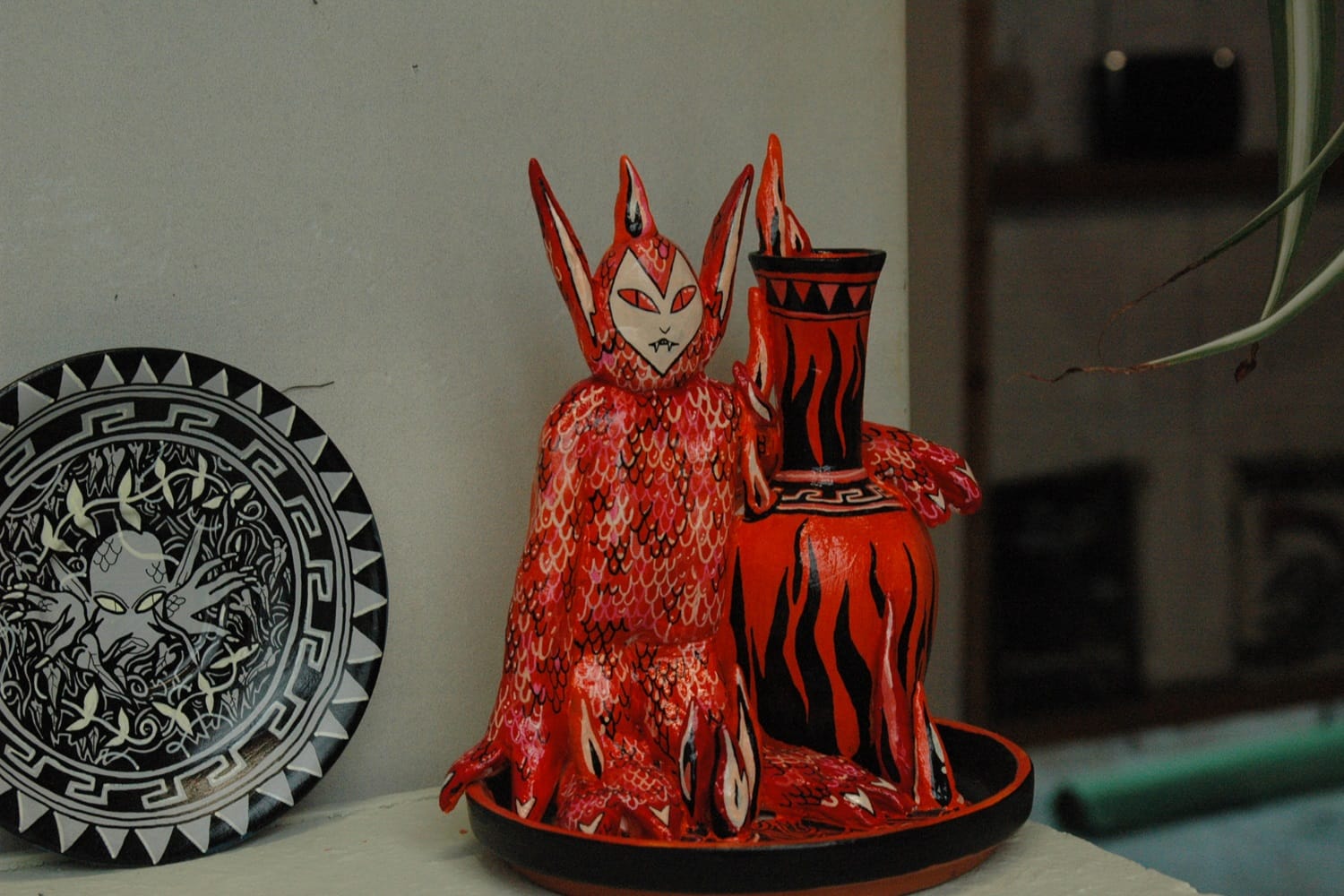 Scaly female figures are painted onto small plates. A devil-like sculpture wraps its arm around a miniature vase engulfed in flames.Her choices of subjects include everything from side profiles of Greek emperors, shape-shifting mythic creatures like the selkies and púca, to the cast of The Real Housewives of Beverly Hills.