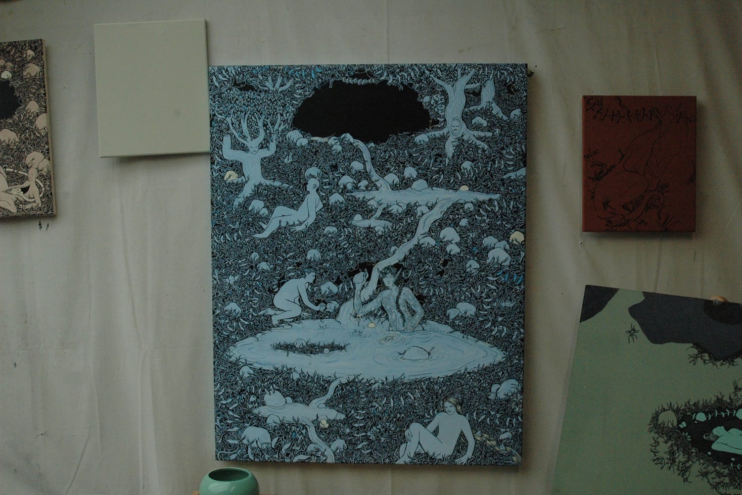 On a canvas hanging from the wall, a moustachioed man pulls the intestines from an alien-like figure with long pointy ears, as it calmly lies among rocks and tangled grass by a pond.
