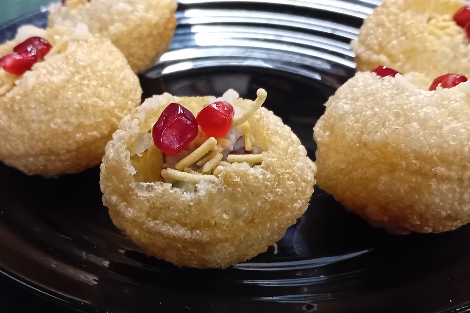 The five hollow dough balls are fried and filled with potato mashed with onions, coriander, spices and a tamarind-mint water. They’re garnished here with pomegranate seeds.
