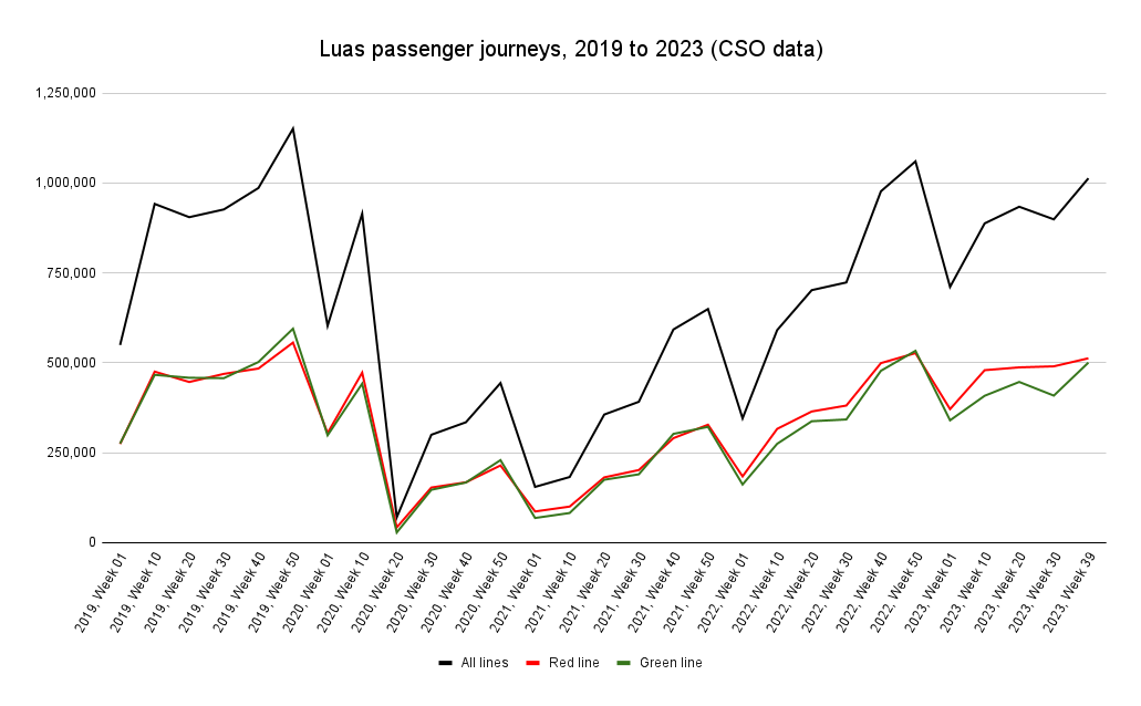 Luas ridership crashed during the Covid lockdowns, but has bounced back. It’s now basically back to pre-Covid levels, according to CSO figures.