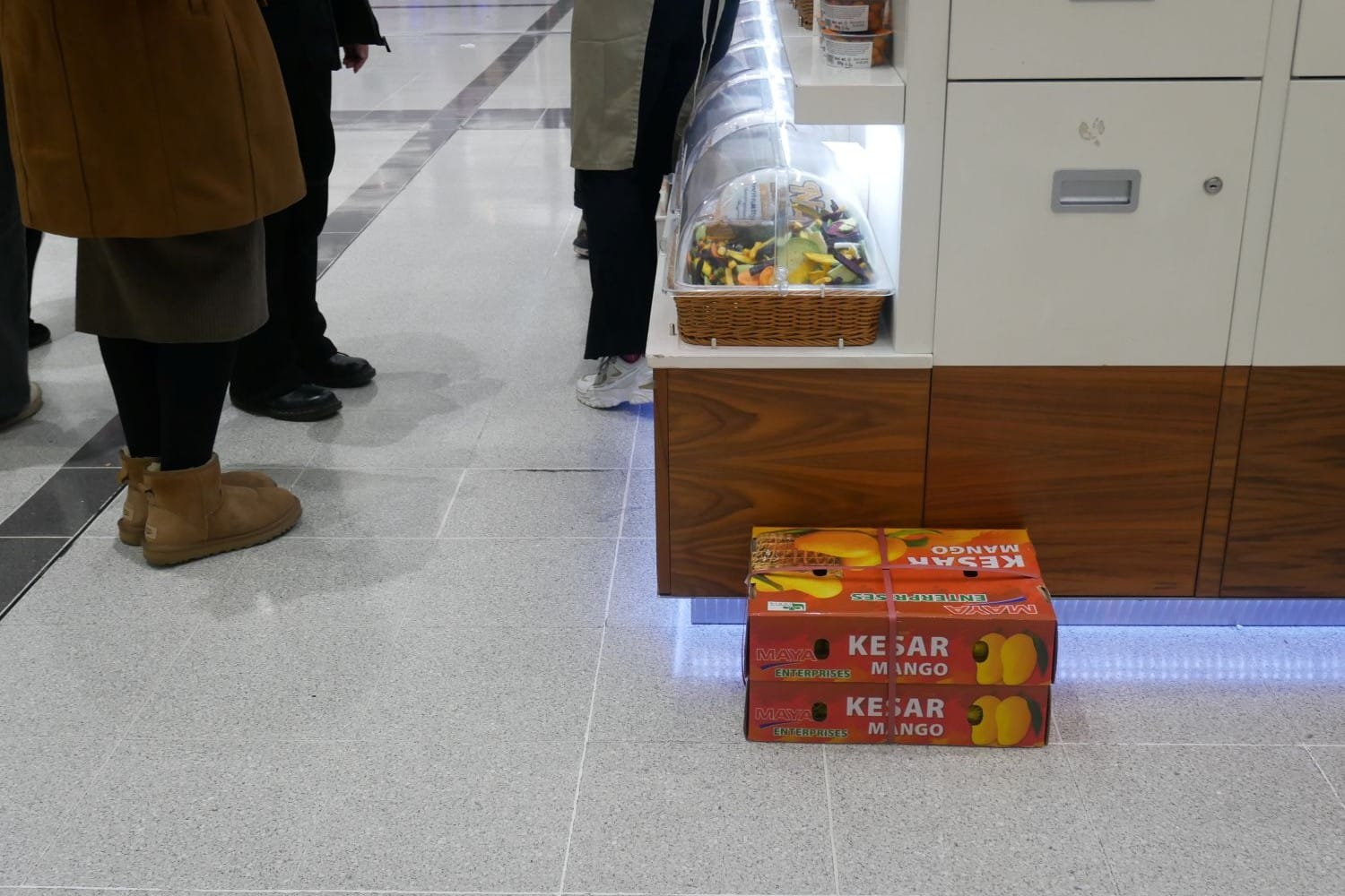 Three boxes of Alphonso mangoes are carried through the swinging doors of the stairwell and out towards where he is stood, in the main concourse at the corner of the Nutty Delights kiosk.