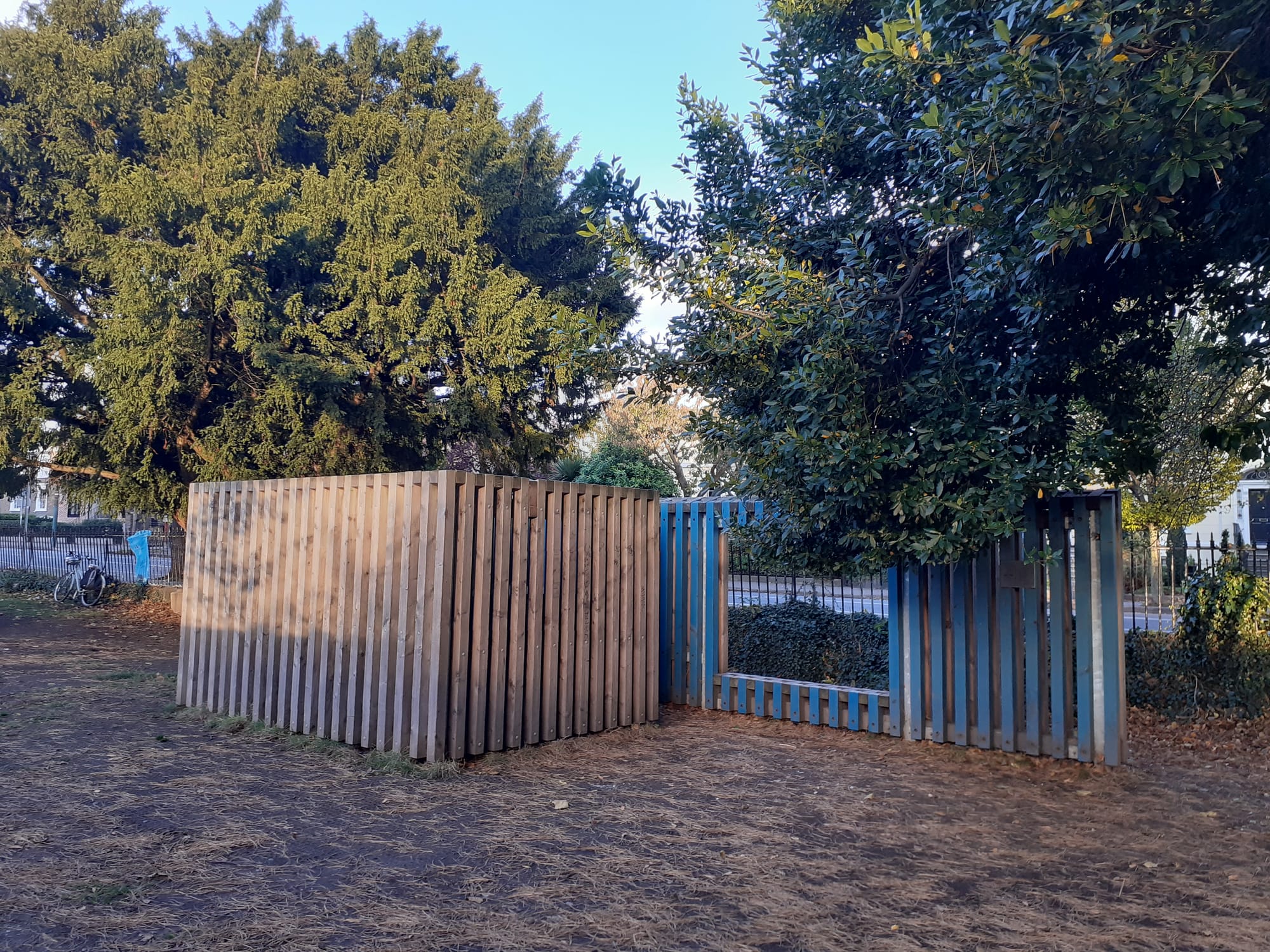 By the path into the park is “free-play” equipment, upright planks of wood around a two-metre-tall square structure.