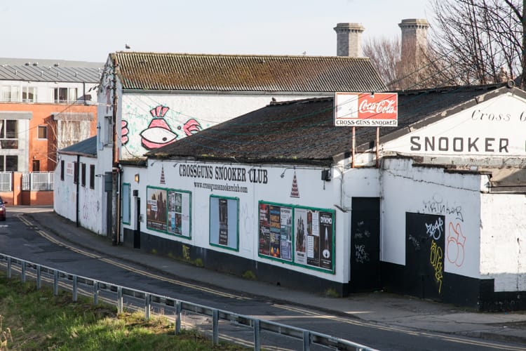 There is near silence inside the CrossGuns Snooker Club. The room is pitch-black at the edges, the only lights coming from six lamps hanging over six snooker tables which take up the guts of the space.