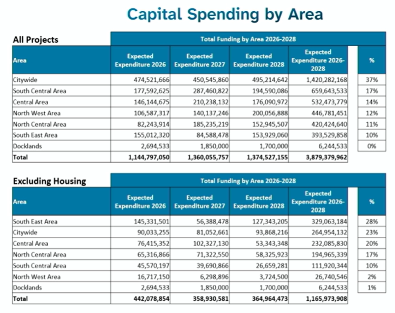 On Monday evening, Enda Currid, the council’s head of management accounting, broke down how much each of the council’s five areas is expected to get from capital funding, with figures including the housing spend and without.