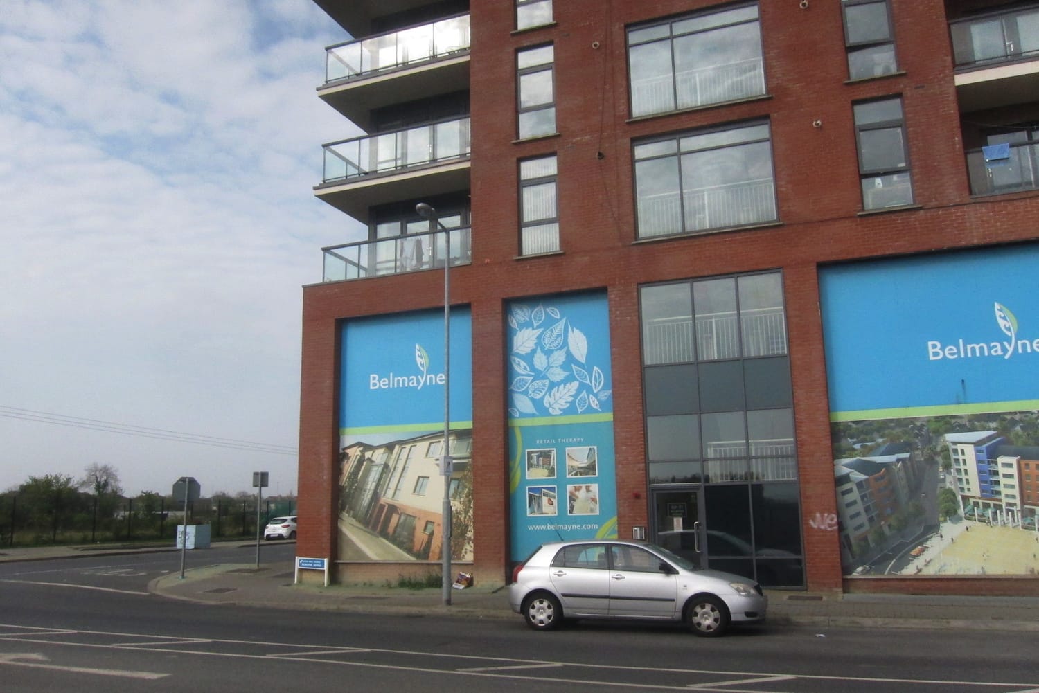 Weather-stained boards on the ground floor of buildings at the corner of Belmayne Main Street and Belmayne Avenue present images of a vibrant urban quarter.
