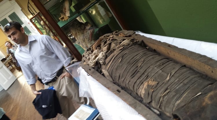 When it was discovered in 1888, the mummy seems to have been passed along to Trinity’s Anatomy Department, where Bennett pored over it. And then little was heard of it for a while. Until, a few years ago, it was dug out again from where it had been kept propped against a wall in an alcove under the banked seating of an old lecture theatre.