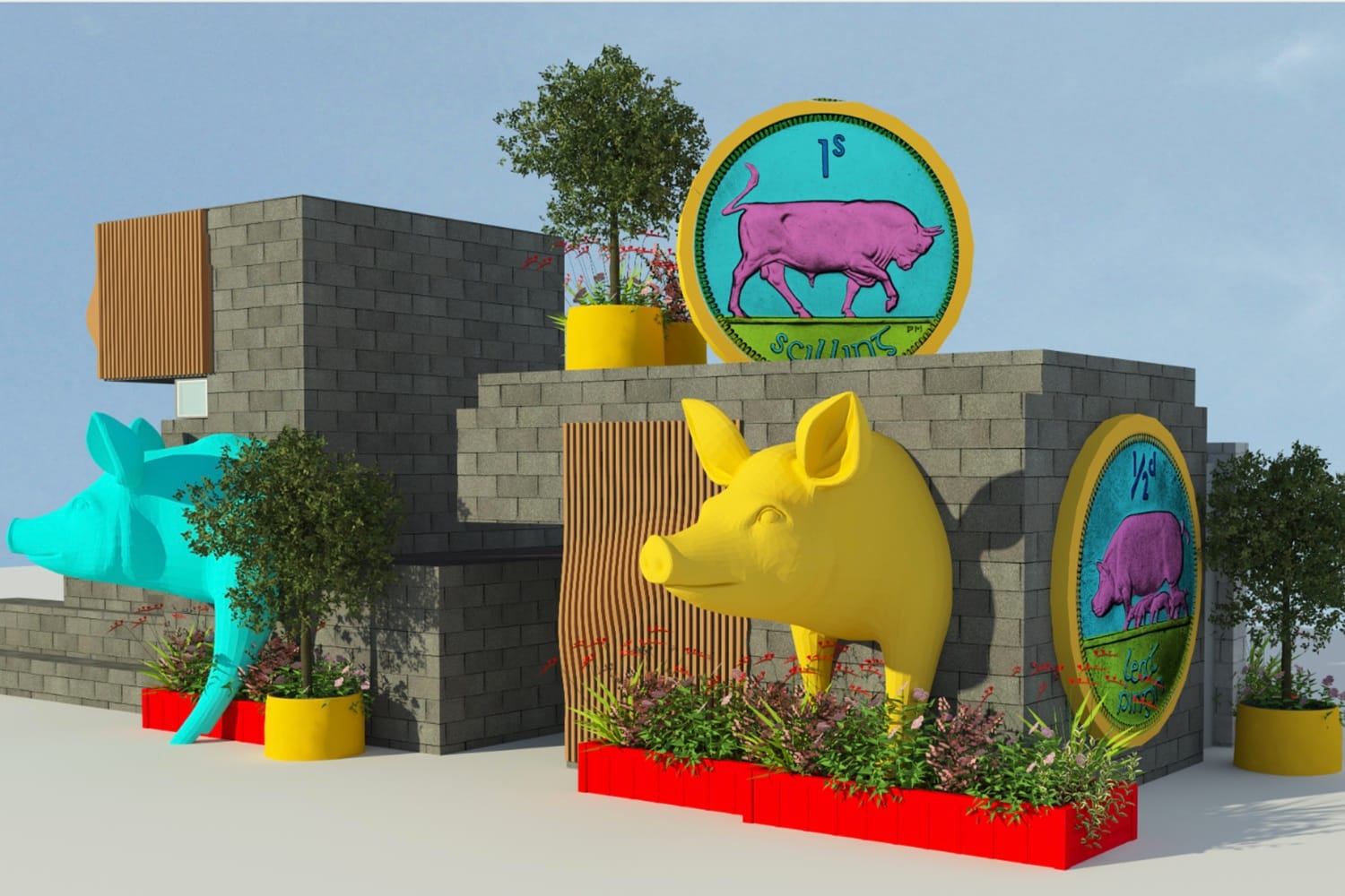 Computer-generated visuals provided by Fáilte showed a series of large sculptures of old Irish coins and colourful pigs surrounding the brutalist public toilets on the square.