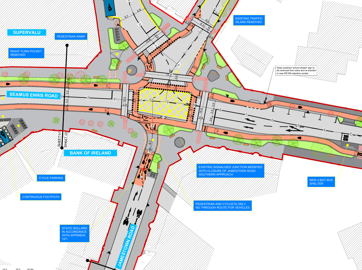 It’ll involve the segment of Seamus Ennis Road from its junction with North Road east to its junction with Clune Road. As well as Jamestown Road from the five-arm junction in the village south to Main Street.