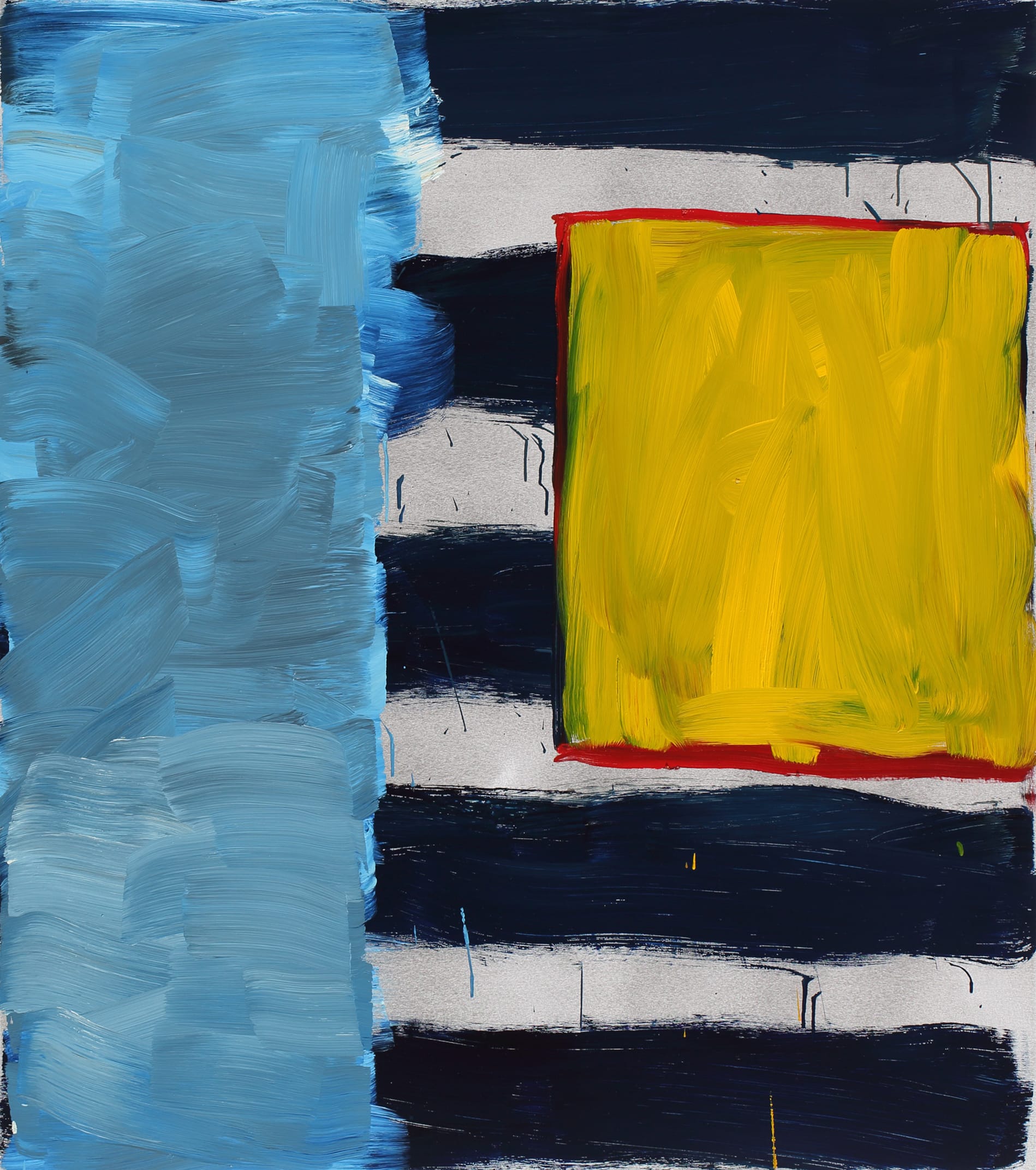 It has a wavy blue vertical band on the left, and white and navy horizontal stripes on the right, which are partially covered by a square patch of bright yellow bordered by a thin strip of red. The colours of the piece are wonderful and evoke the sensations of a summer’s day at the beach.