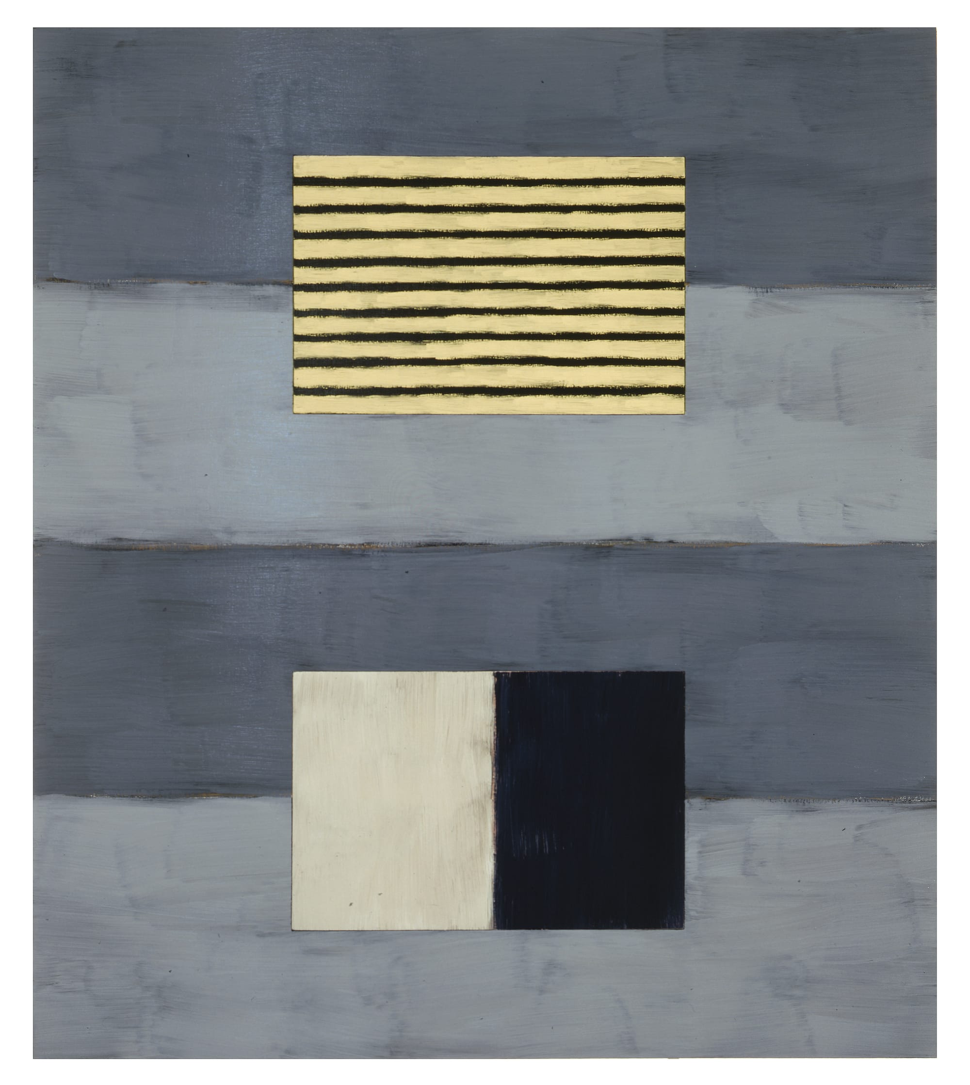 The painting is a triptych. The section on the left is made up of thick horizontal bands of light pink and dark blue. The one on the right has three vertical bands of red with an underlayer of yellow and a similar dark blue. The middle section, which is raised, consists of very roughly applied white and black stripes.