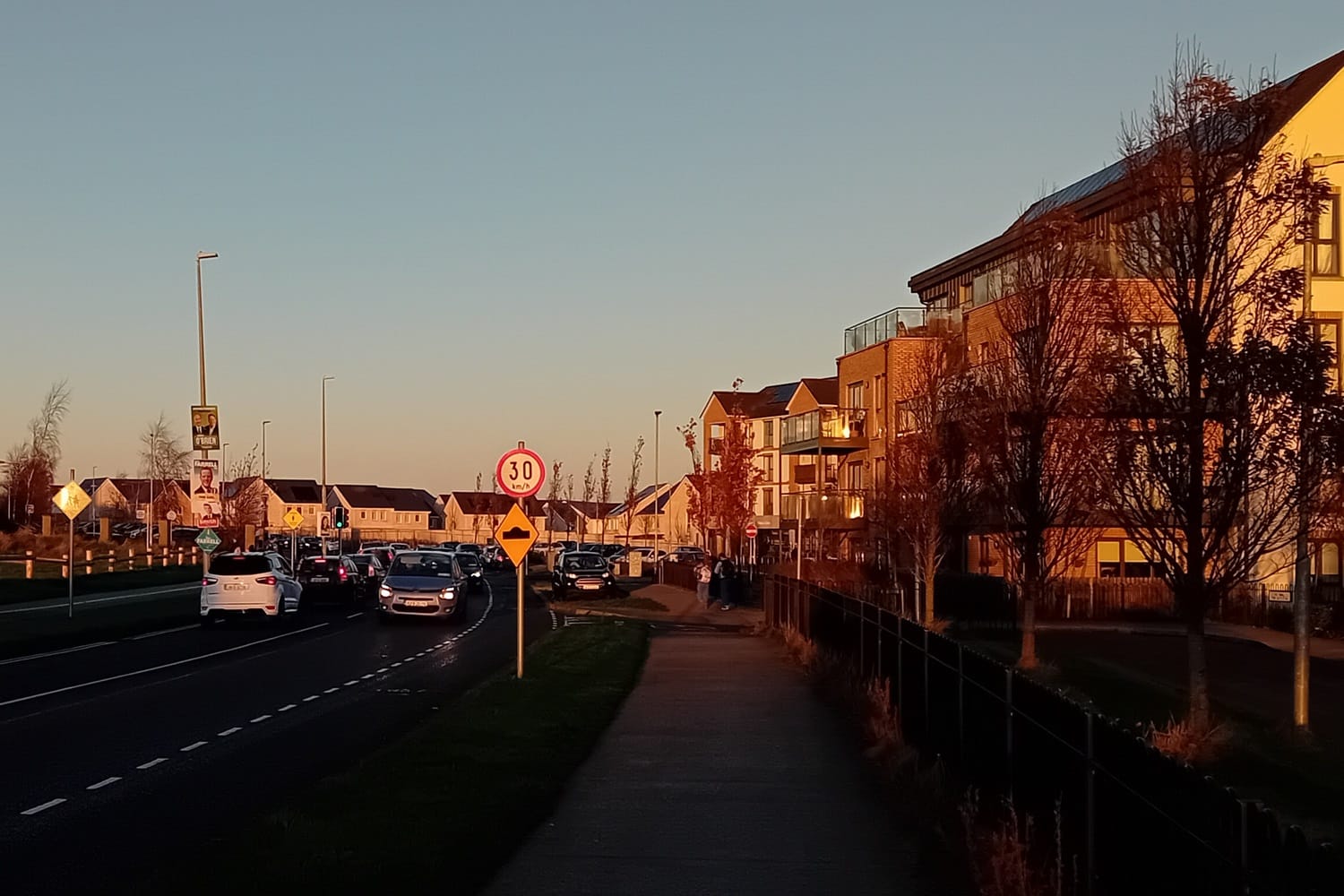 Already, the Glen Ellan Road was clogged with traffic heading east, while parents walked their children west towards the Swords Educate Together School.