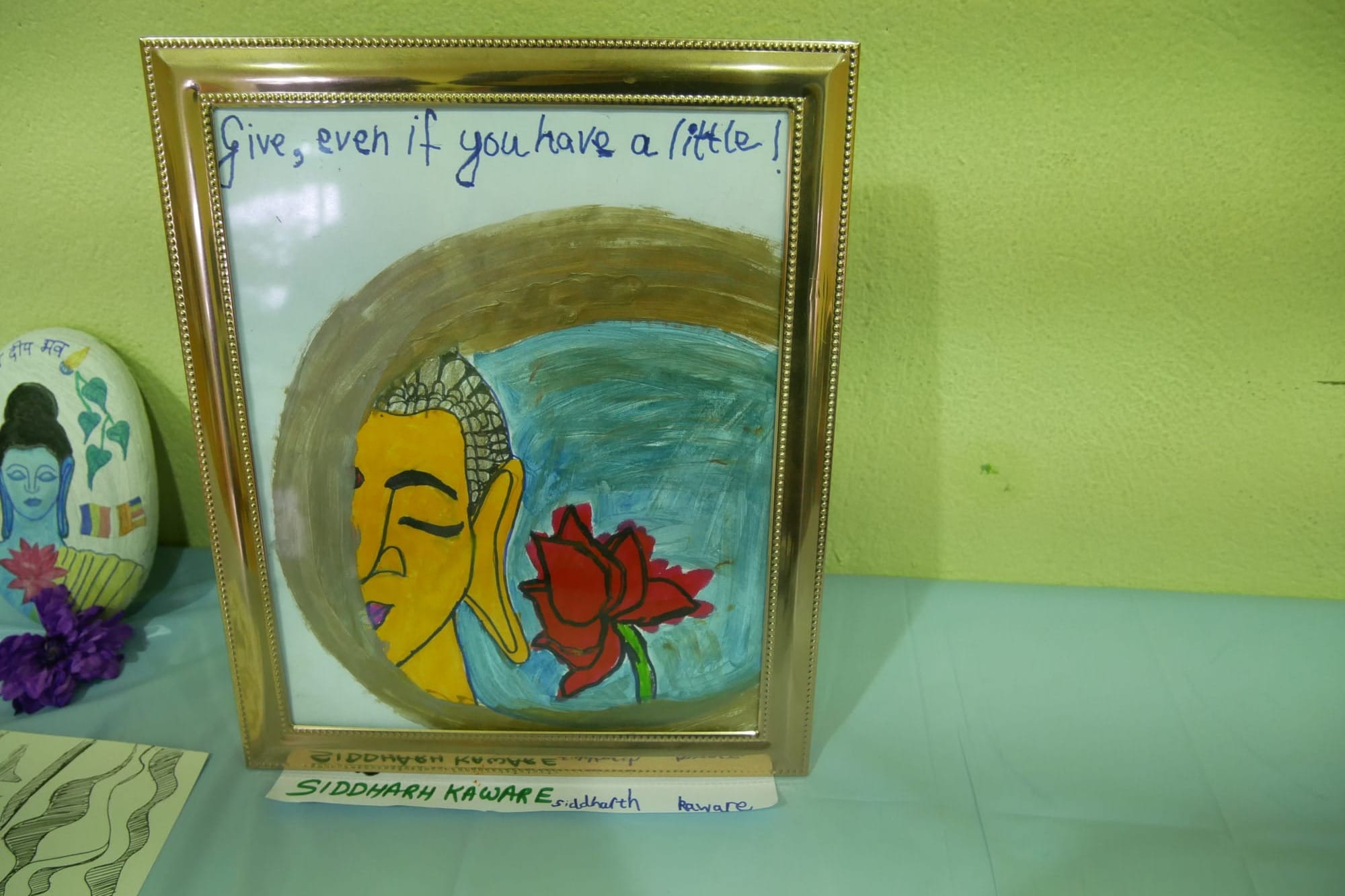 Another painting shows a Buddha and a lotus and a caption in blue pen: “Give, even if you have a little!”