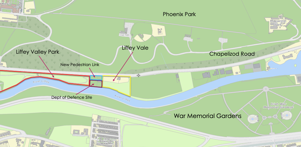 A footpath through former Department of Defence lands, in the middle, would connect the Cois Abhann Biodiversity Centre with Liffey Valley Park.