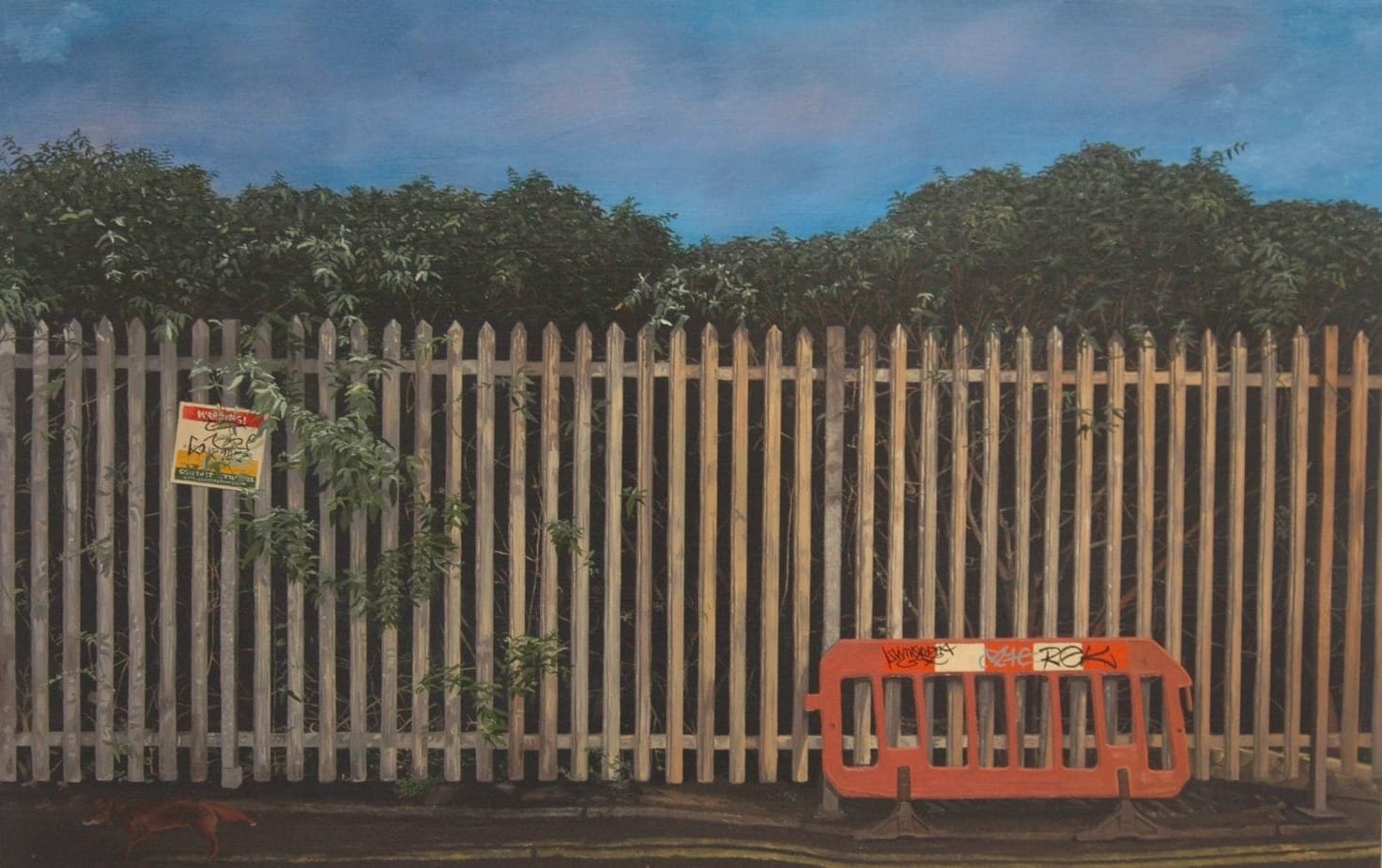Her version of the site took its fencing and the weeds, a graffiti-strewn warning sign and an orange plastic barrier, and added a fox, while stripping away the surrounding buildings.