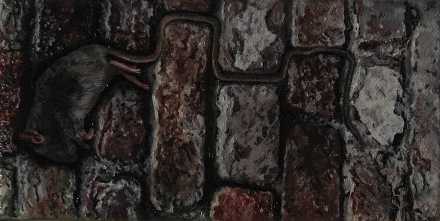 The small oil painting depicts a mouse lying, possibly dead, possibly sleeping, on a brick wall, with an unusually elongated tail winding around the brickwork.