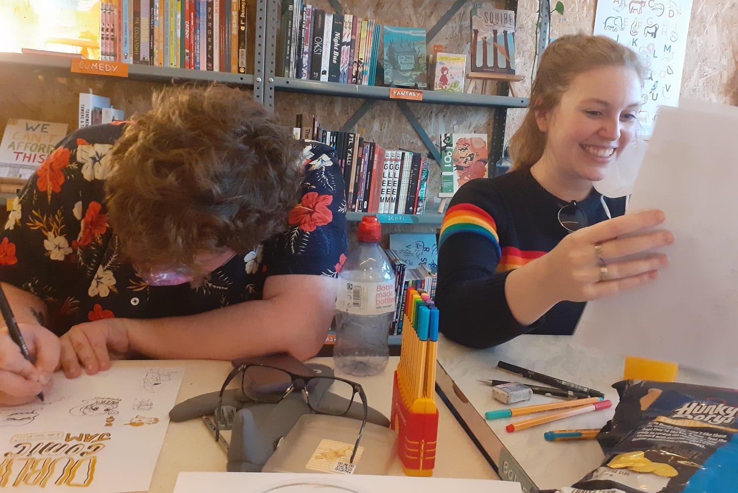 “I really like this, it’s really cool,” says Foyle, settling down at the shared table in the centre of the room, which is usually covered in comics but cleared for the comic jammers, and pouring a glass of Club Orange.