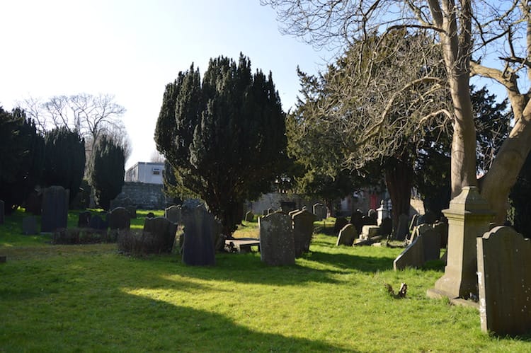 This garden cemetery spreads across two acres. Large grey stone slabs and crosses are scattered on the grass. The graves were once found using a grid system, referencing numbers on one wall and letters on the other.