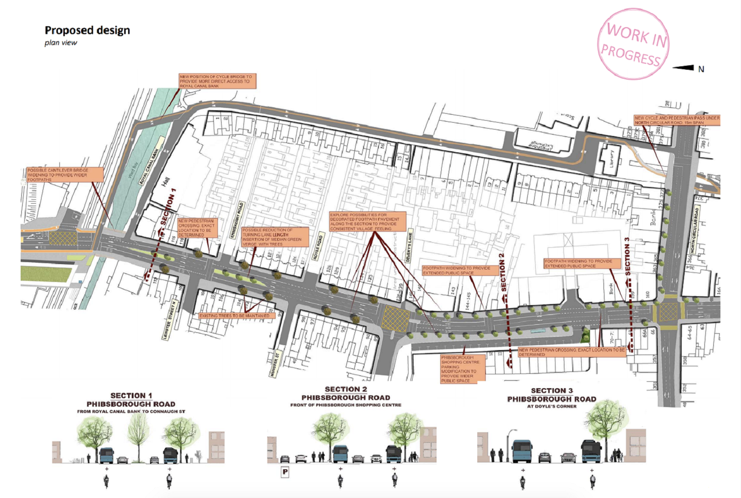There’s also footpath widening at different spots on Phibsborough Road, alongside “possibilities for decorated footpath pavement along the section to provide consistent village feeling”, according to the plan.