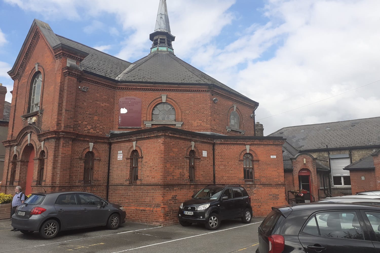 A timber sign props open the door to the artists’ studio at St Andrew’s Community Centre on the South Circular Road.