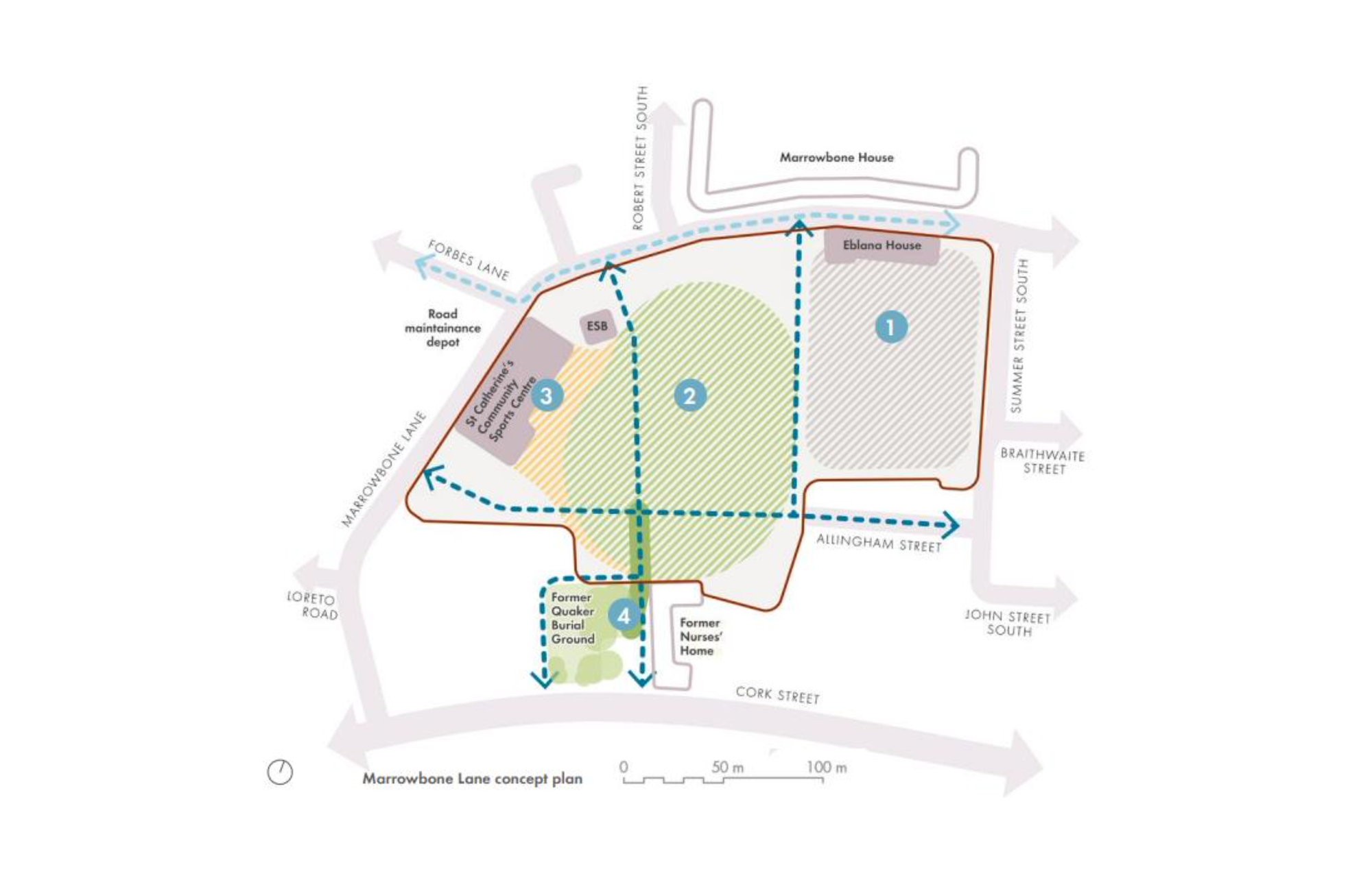 At the moment, the council is using the 4.1-hectare Marrowbone Lane depot site as a base for its area offices in Eblana House, as well as wastewater, roads maintenance and waste management services, and the St Catherine’s Sports Centre.