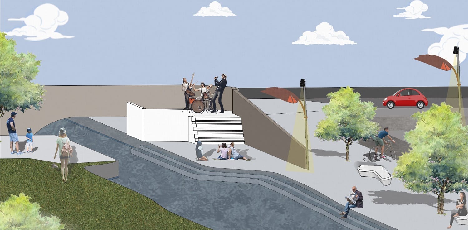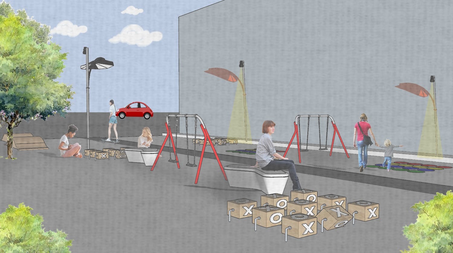 Their mock-ups for near the canal have sets of swings near the canal, a large tic-tac-toe board, seats, and a food truck to bring people together.