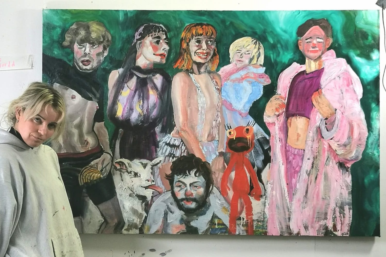 The piece she intends to work on this evening is a darkly comedic apocalyptic scene set against the backdrop of a fiery urban landscape.