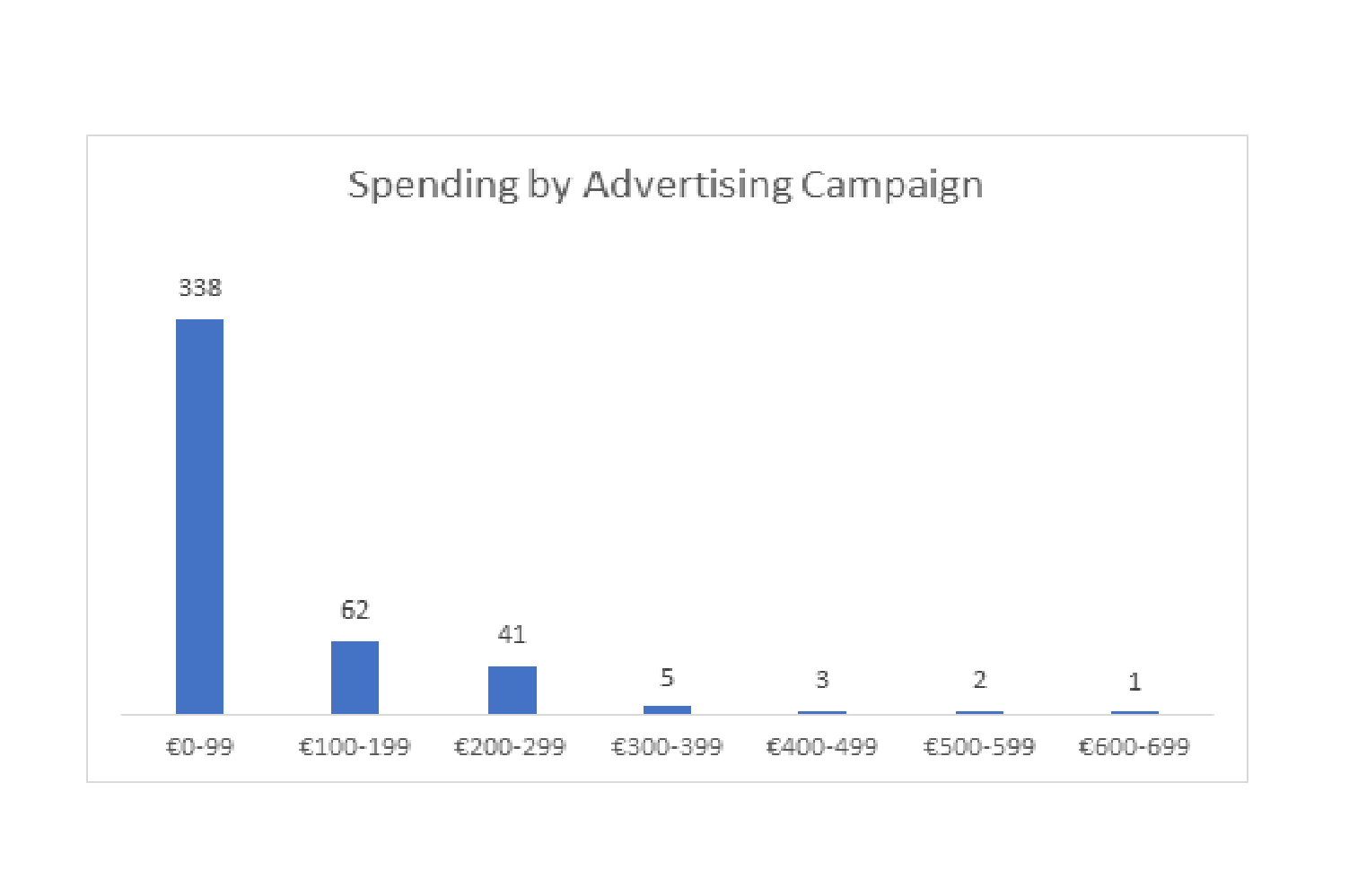 The Labour Party spent the most on a single advertising campaign: between €600–€699. Fianna Fáil and Sinn Féin spent between €500–€599 on their adverts.