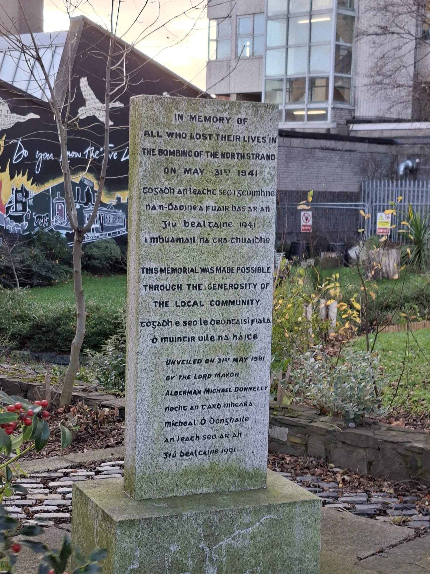 In the garden, there is a stone column. On it, an inscription: “In memory of all who lost their lives in the bombing of the North Strand on May 31st 1941”.