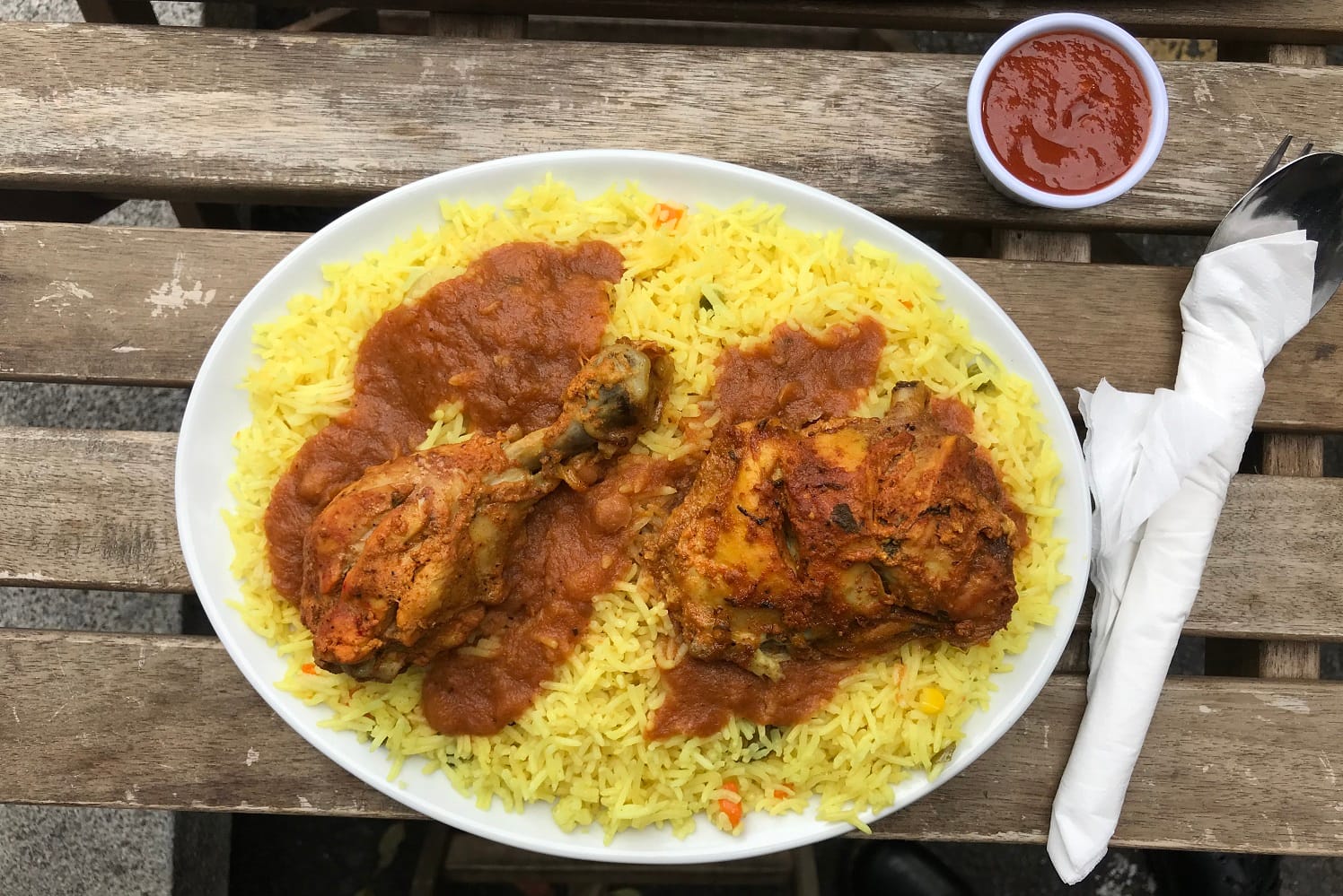 The chicken is served on a bed of pilau rice, which is cooked with corn, peas, and baby potatoes. “It’s a really quirky style of making rice,” Junaid says.