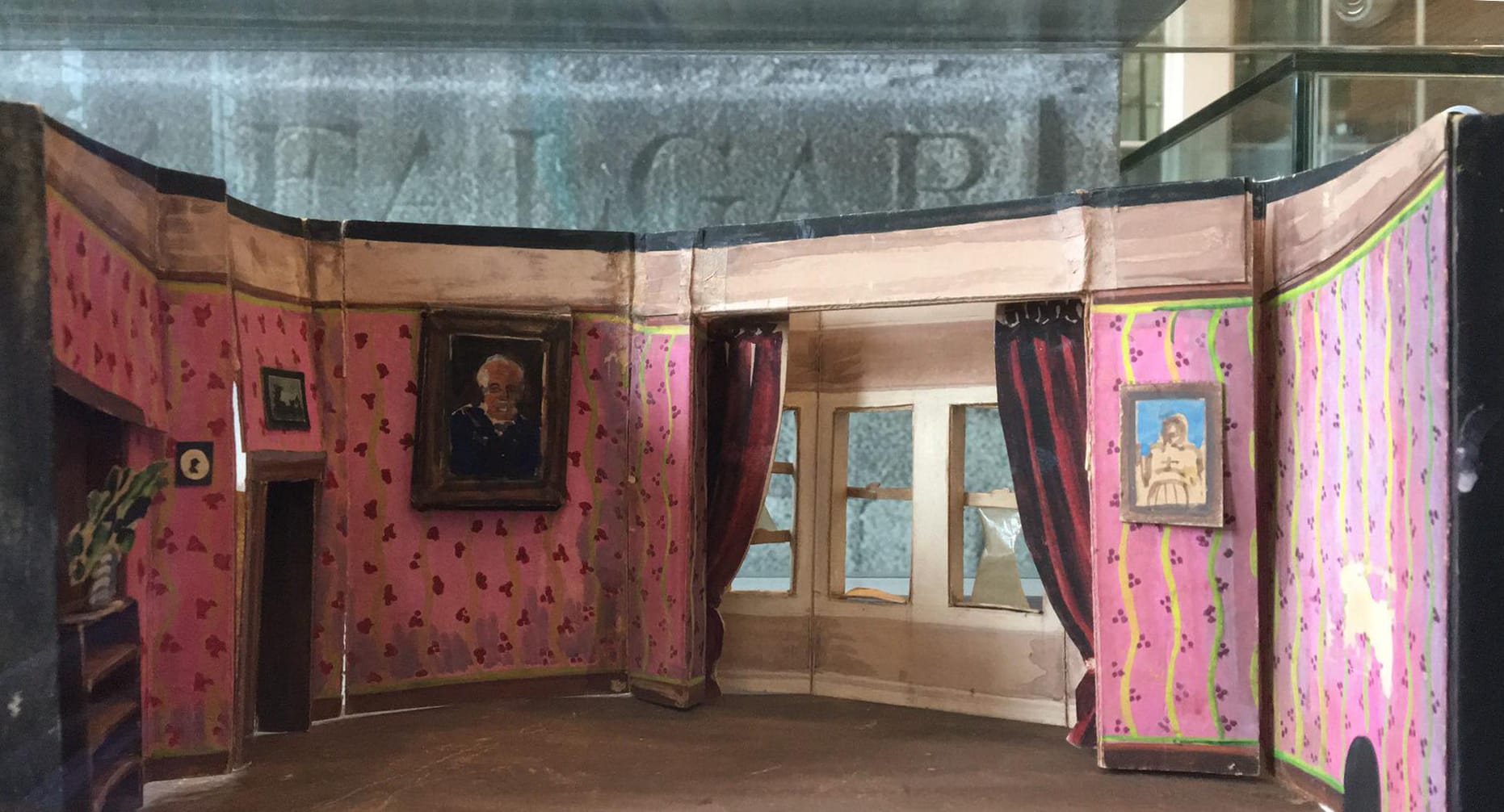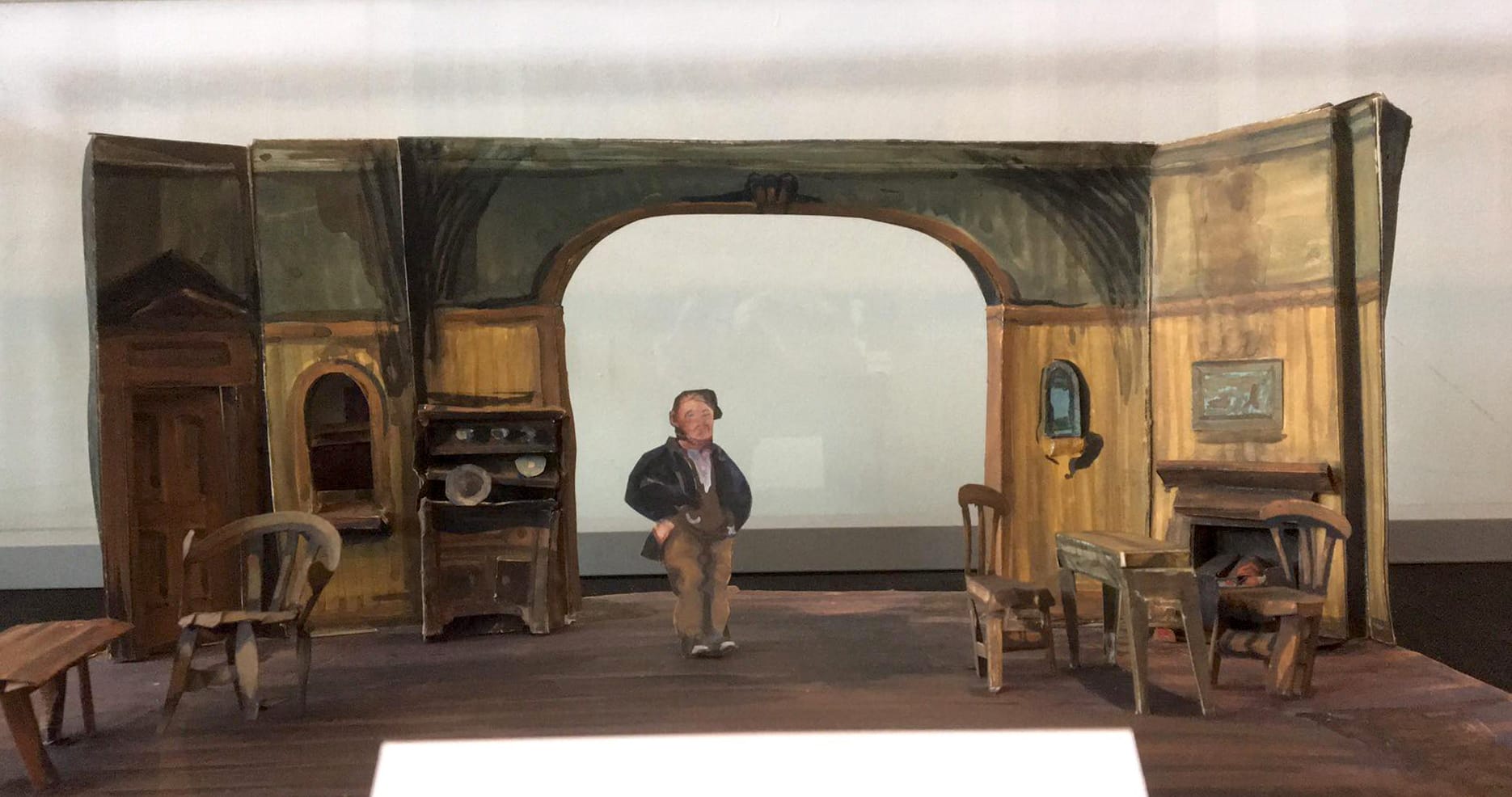 There are tiny tenement and pub scenes, chairs and tables, figurines of characters and painted fireplaces and doors. There are also some sketches for sets.