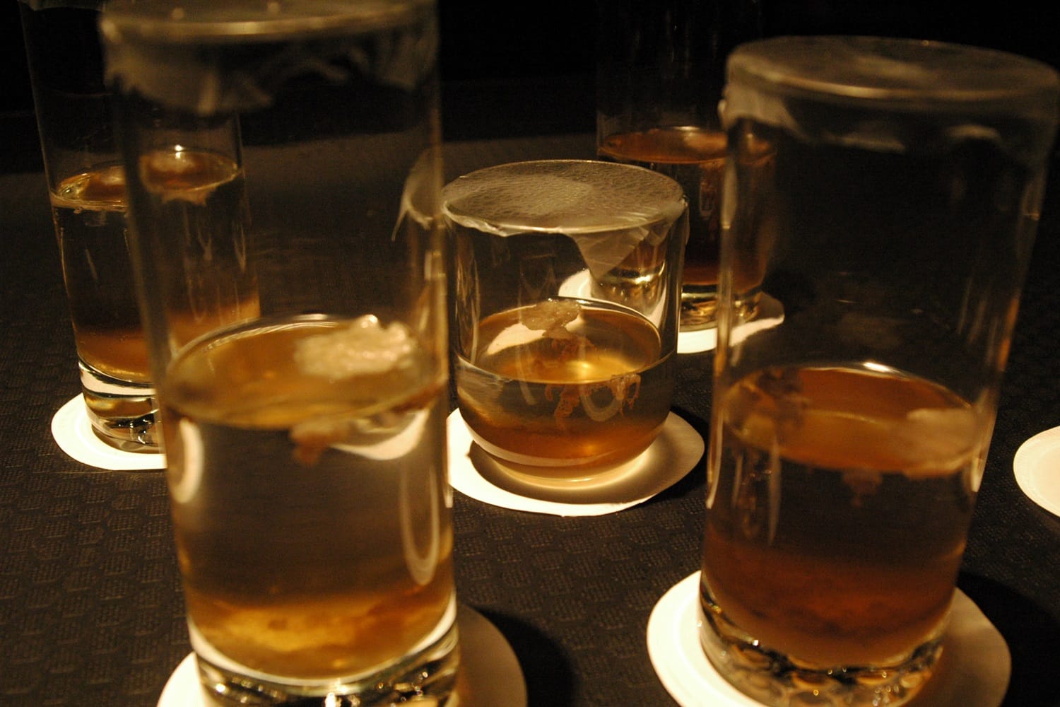 Inside the glasses is the golden glow of a liquid with floating grey organic matter. Banana DNA, she says.