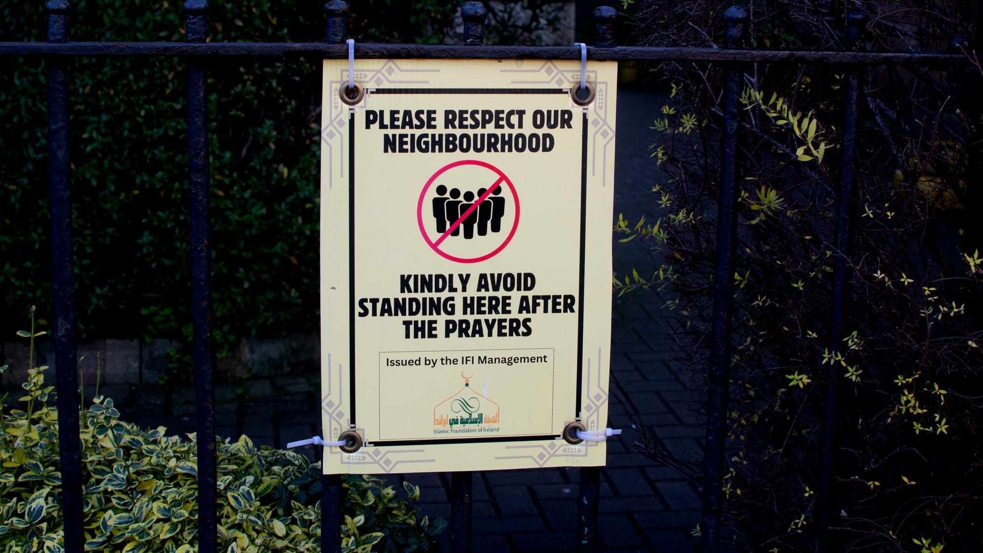 On Friday, signs on the masjid’s gates urged worshippers not to mill about on the street after prayers. “Please respect our neighbourhood,” it said in black text against a yellow backdrop.